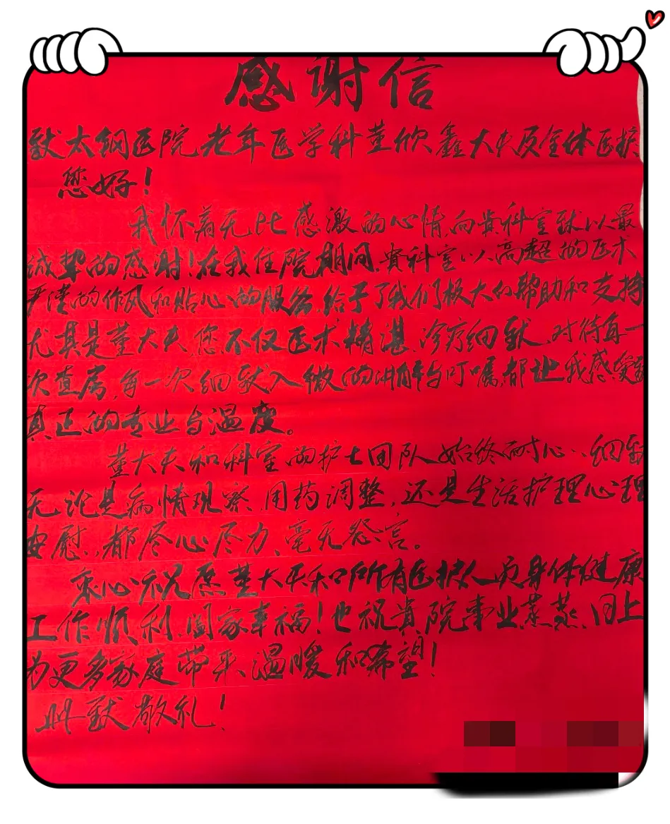 康复出院后,老人始终记挂着这份恩情,特意用大红纸写下感谢信,字里行间满是感动:“每一次查房,每一次细致入微的讲解与叮嘱,都让我感受到真正的专业与温度。”