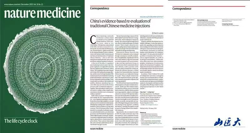 《自然·医学》 是《自然》出版集团旗下的旗舰医学期刊,五年影响因子为52.4(2024年),是衡量生物医学领域重大突破的标杆性期刊。这一成果的发表,既是陈晨教授团队深耕心血管与神经科学交叉领域的科研结晶,更体现了医院“科研引领临床、临床反哺教学”的育人理念,为全国中药注射剂再评价工作提供了可参照的科学范式与实践依据,也为校院联合培养研究生搭建了高水平科研实践平台。