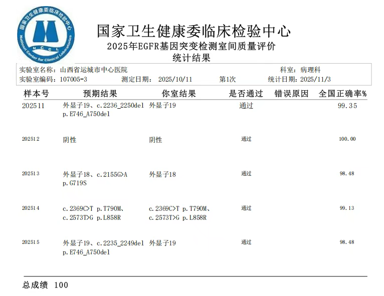 连续四年满分通过国家级室间质评,既是荣誉,更是责任。医院病理科精准医学分子实验室将以此为契机,持续聚焦精准医学前沿技术,不断拓展检测项目、优化服务流程,以更精准的检测、更专业的服务助力临床诊疗,为保障运城及周边地区群众健康注入更强动力。