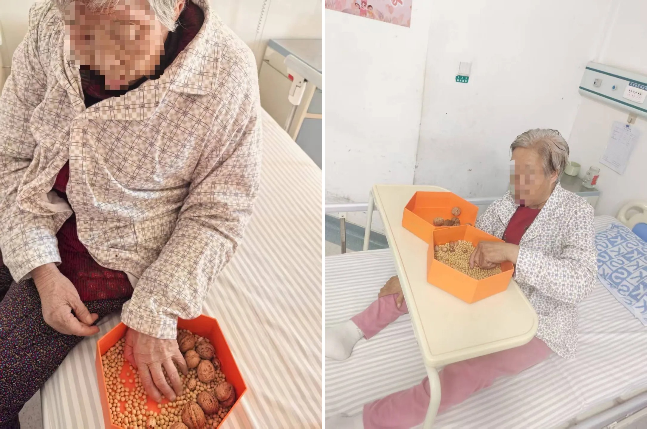 2025年,康复科收治偏瘫患者占比约75% ,均伴不同程度的上肢功能障碍。为提升此类患者康复训练成效,改善手指灵活度,科室将康复训练延伸至病房开展,进一步深化康复护理服务内涵。6月,在康复治疗师和护士的集体努力下,科室开展了偏瘫患者“捡豆子”手指功能训练活动,物体直径从5mm(绿豆)到10mm(黄豆)、20mm(核桃)逐步增大。半年来,单个训练和集体训练实践活动得到患者及家属的一致认可。活动既丰富了患者住院生活,又提升了家属及患者的满意度。