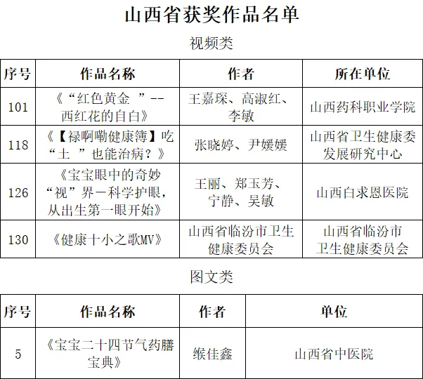 为持续推动健康知识普及,不断满足人民群众日益增长的健康知识需求,国家卫生健康委、国家中医药局、国家疾控局、全国总工会、中国科协共同组织开展了“健康知识普及行动——2025年新时代健康科普作品征集活动”。活动得到各地各有关部门的高度重视,各地积极组织并动员开展作品上报工作,共征集作品47950件。根据评审规则,山西省共上报作品30件,其中5件获评优秀作品。
