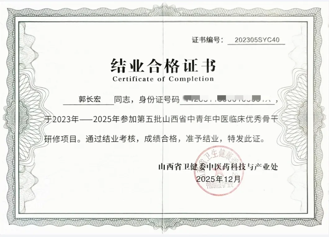 参加此次省级中青年中医临床优秀骨干研修项目期间,郭长宏主动对标省内外中医专家,深入钻研中医前沿诊疗技术与思路,积极参与学术交流研讨,持续提升专业素养与诊疗能力,最终以优异表现通过考核,充分展现了乡宁县人民医院中医人才的过硬实力。
