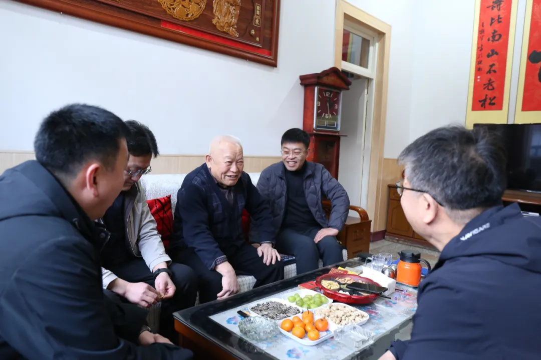 在赵玉俊老院长家中,辛琳琳关切询问老院长的身体状况与生活起居,简要介绍医院近年来的发展成果与未来规划,认真倾听老院长对医院建设的意见建议。