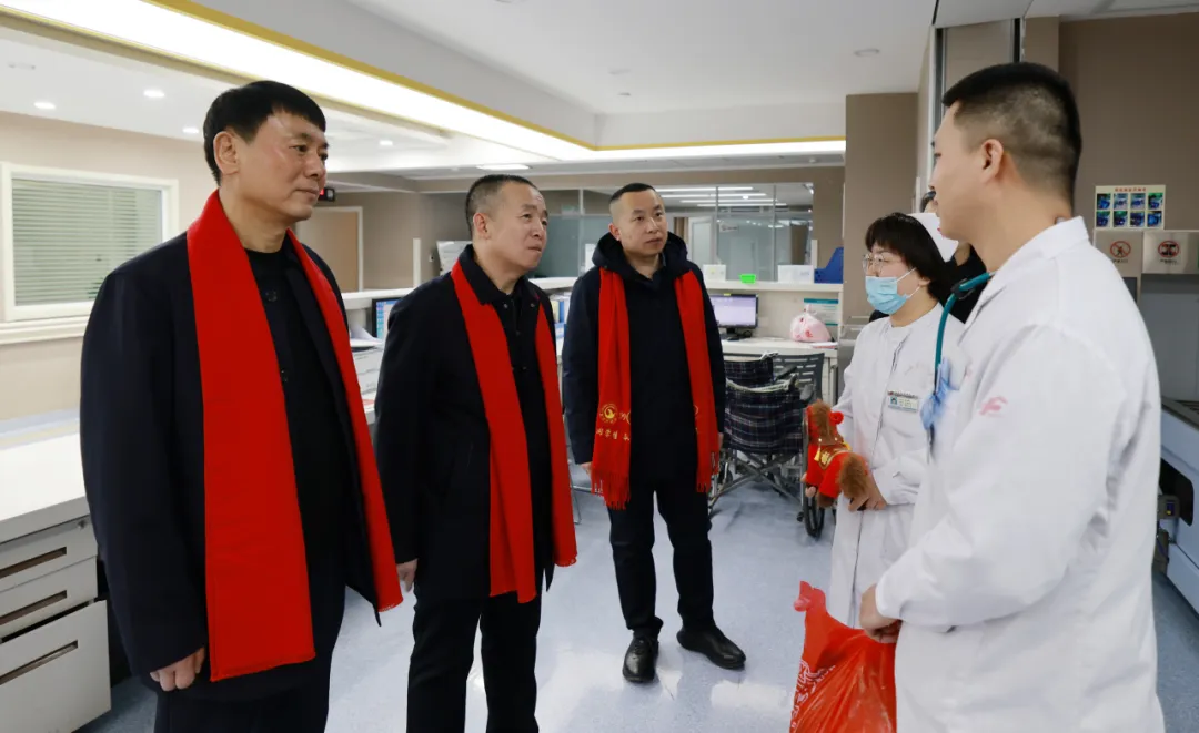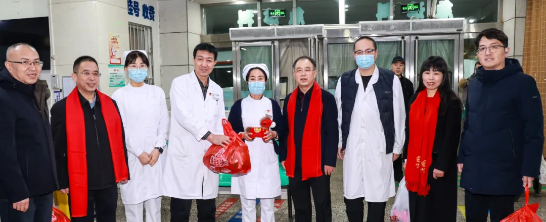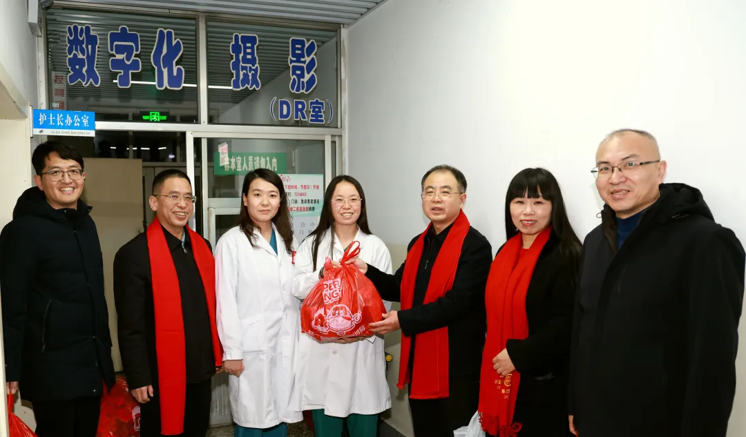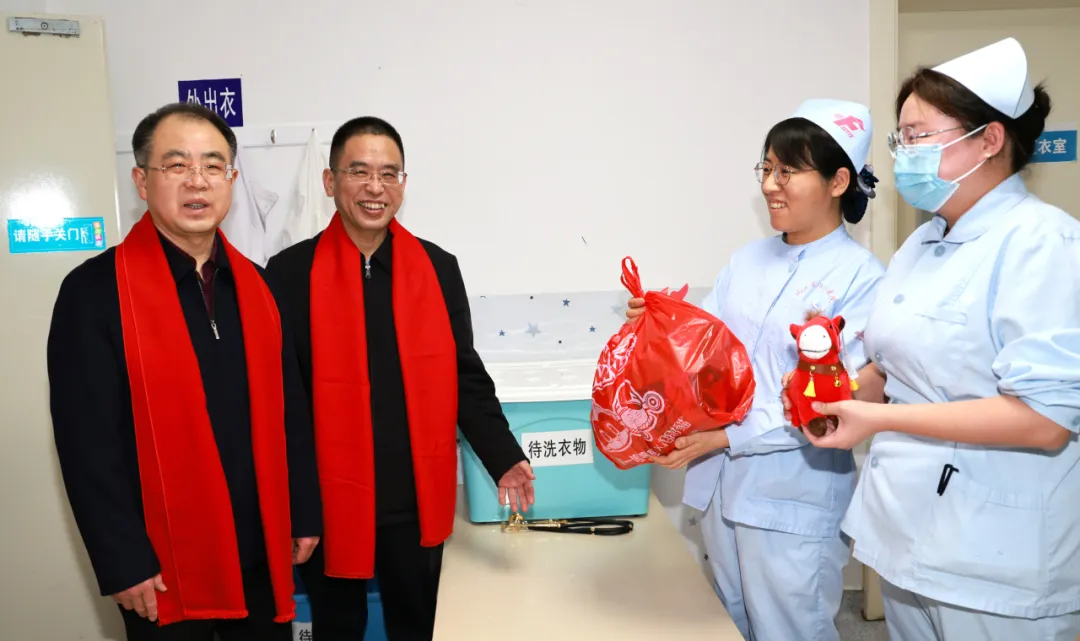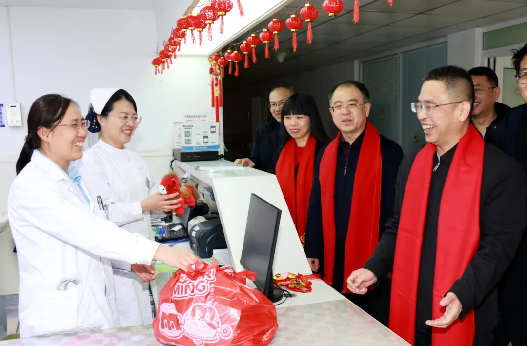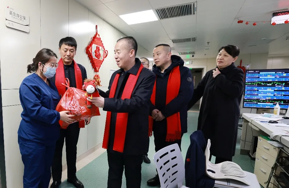 “大家辛苦了!给你们拜年了!”“节日期间,我们三甲医院承担着重要的危急重症救治任务,一定要保障每一位患者得到及时科学的救治!”慰问组每到一处,都与值班人员亲切交谈,详细询问节日期间的患者收治情况、医疗安全保障等,叮嘱大家要时刻绷紧医疗安全这根弦,密切关注患者病情变化,细致做好诊疗护理工作,既要用专业的医术为患者解除病痛,也要用暖心的关怀缓解他们的思家之情,让患者在医院也能感受到浓浓的年味与家的温暖。院领导还嘱咐值班人员合理安排好工作与生活,平安喜乐地度过马年春节。同时,感谢每位值班人员舍小家,顾大家,为全市人民的健康默默守护。并为大家送上灵动喜庆的骏马吉祥物与满载心意的慰问品,传递节日温暖与悉心关怀。勉励大家在新的一年策马扬鞭、马力全开,开拓创新,砥砺奋进,向着“十五五”规划目标接续奋斗,共同书写医院高质量发展新篇章。