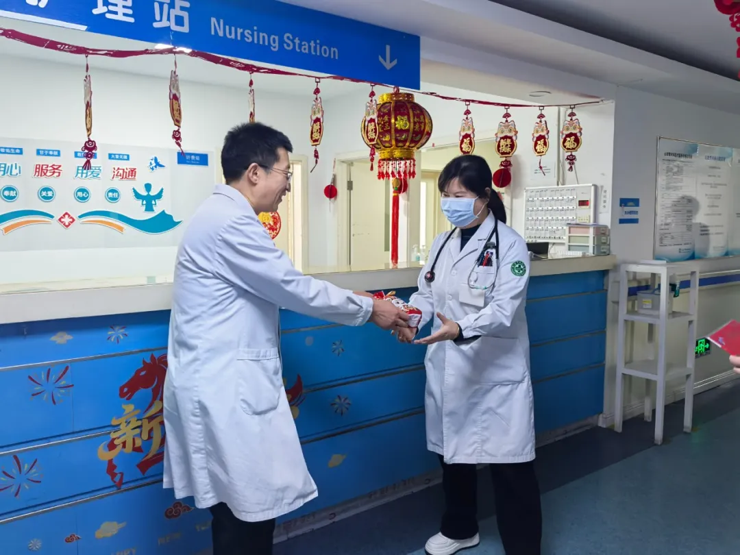 在门诊综合楼,院领导与门诊、急诊、住院、医技、窗口等各科室一线值班人员亲切握手,详细询问节日期间就诊量、医疗物资储备等情况,对大家一年来为保障人民群众身体健康付出的辛勤努力表示衷心感谢。走进产科楼,院领导重点关注产妇接诊、母婴护理等工作,向坚守岗位的医护人员致以诚挚问候,叮嘱大家精益求精做好诊疗服务,用心守护母婴平安,让产妇和新生儿度过一个温暖祥和的春节。在北院区,院领导深入各科室查看值守情况,与一线员工深入交流,送上新春的美好祝愿。同时,院领导叮嘱后勤安保职能人员,做好各院区水电气保障和安全值守工作,筑牢医院平稳运行防线,全力为一线员工和就诊患者保驾护航。