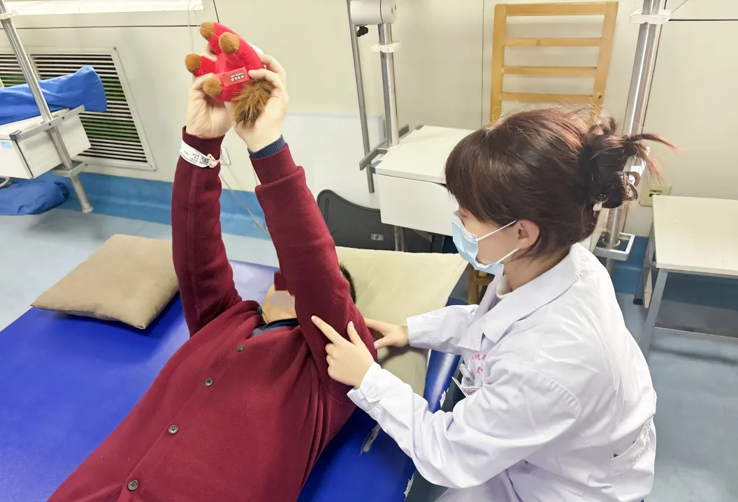 大年初一清晨,康复医学科医护人员捧着红色毛绒小马挂件,走进每一间病房。科主任郭丽云俯身将小马放进患者掌心,一位手臂缠着绷带的大爷颤巍巍接过,家属穿着红卫衣在一旁笑得眉眼弯弯。走廊尽头,患者们在治疗师指导下举起小马练习抬手——“加油,再抬高一点点”,每一次坚持都是走向团圆的脚步。