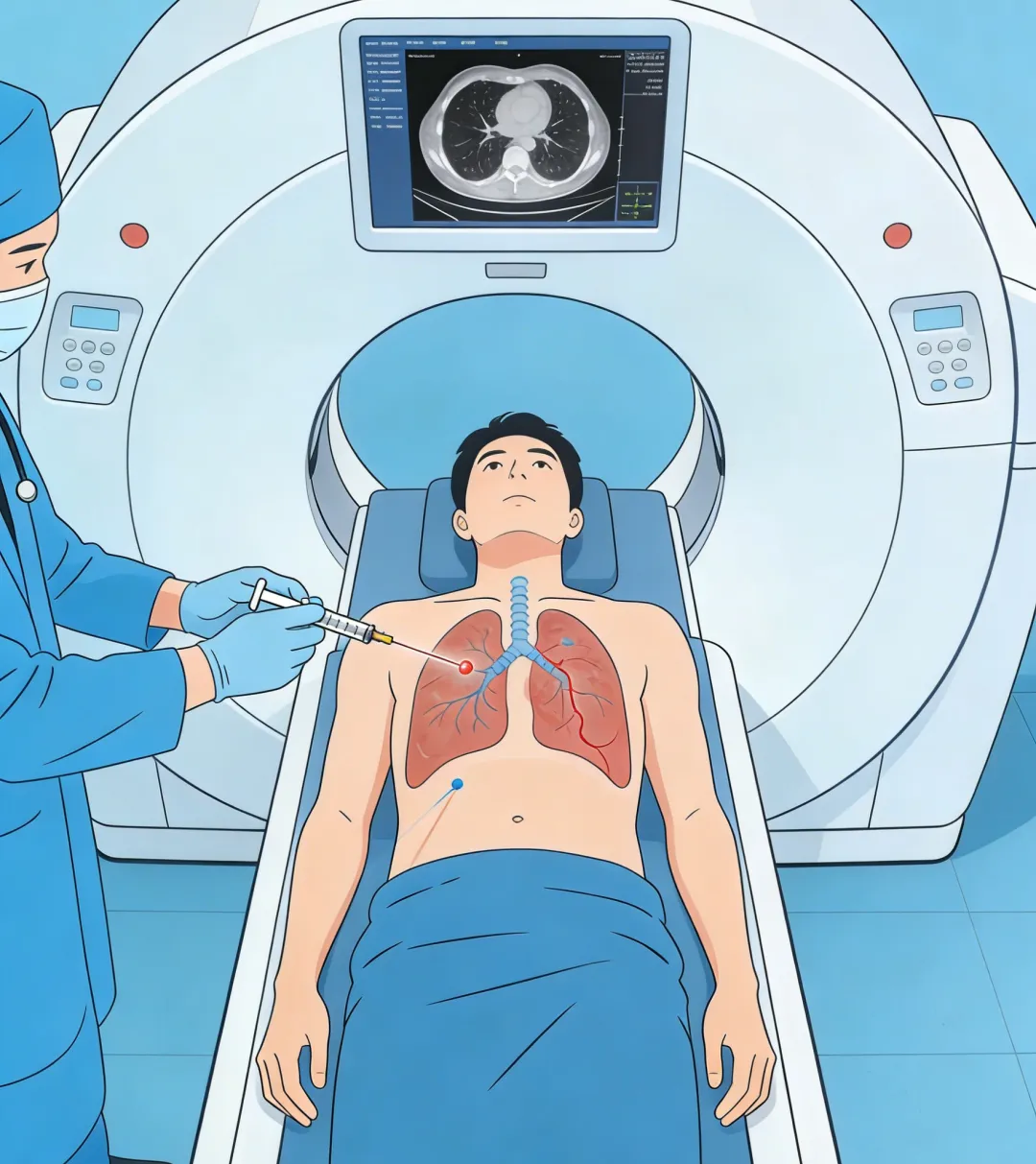 CT引导下肺穿刺活检术是在CT实时影像引导下,用细针获取肺部可疑病变组织,然后进行病理诊断,具有定位准、创伤小(局麻、针眼小)、恢复较快等特点,常用于CT发现肺部结节或肿块,但无法确定其性质;或因为年龄、身体原因无法马上进行大手术,但又必须明确诊断的情况,病理结果准确性高。