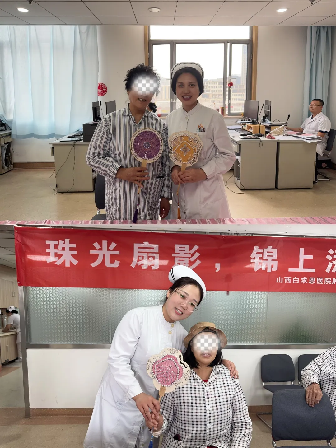 为进一步深化人文关怀服务理念,为患者及家属提供更具温度的照护体验,日前,山西省医院协会副会长单位——山西白求恩医院 同济山西医院淋巴肿瘤科安宁疗护团队在武丽华总护士长的带领下,策划并组织了一场以“珠光扇影,锦上添花”为主题的非遗仿宋锦珍珠扇DIY活动。活动将传统非遗文化与安宁疗护的人文关怀深度融合,为患者及家属带来手工创作乐趣的同时,搭建了情感交流的温馨平台。这不仅是一次传统文化的体验,更是一场关于陪伴、疗愈与生命美学的温柔对话。