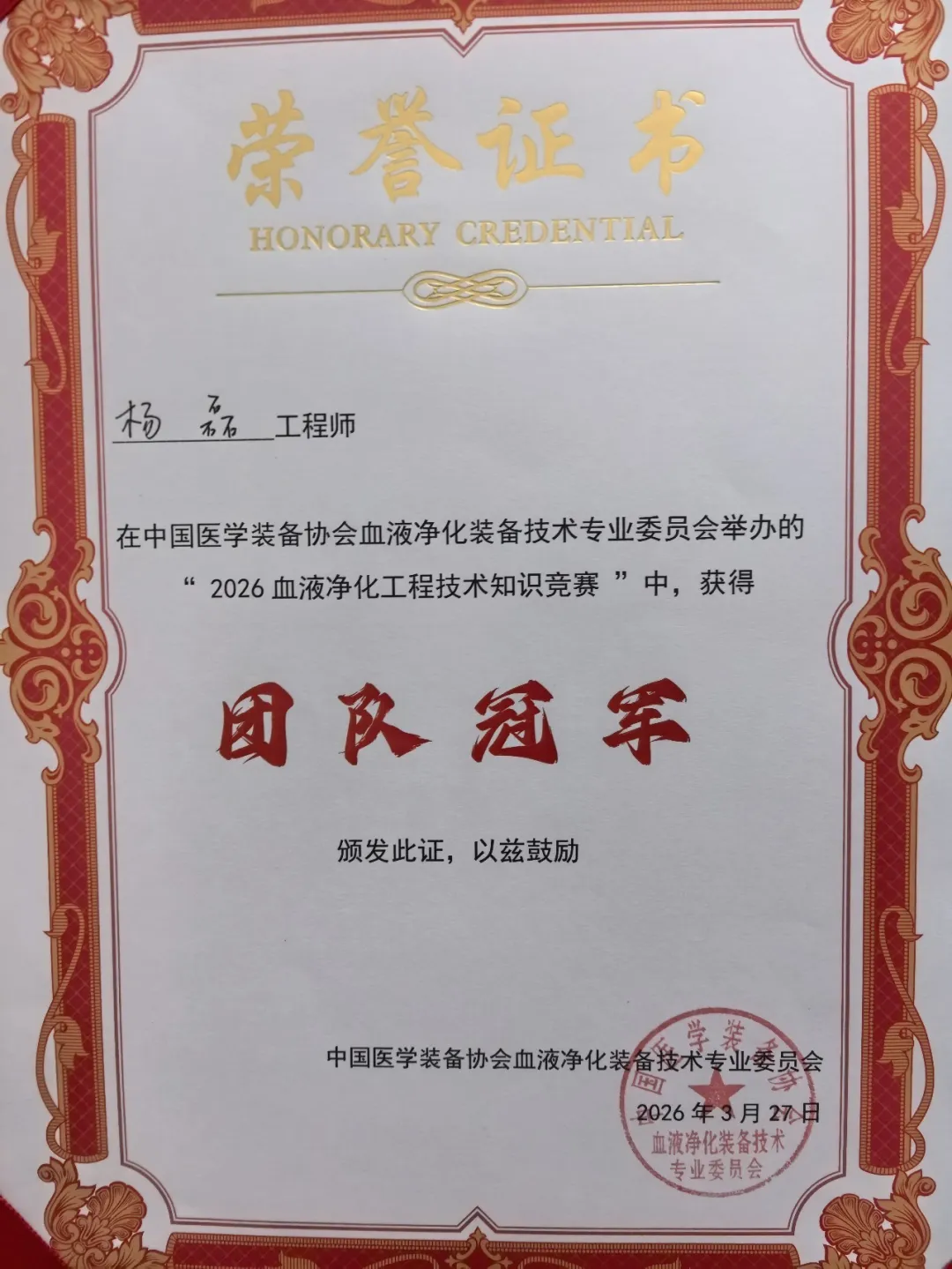 近日,山西省医院协会常务理事单位——太原市杏花岭区中心医院血液净化中心水处理技师杨磊受邀代表山西省赴重庆参加血液净化临床工程(技)师第七届知识竞赛,荣获团队冠军奖。