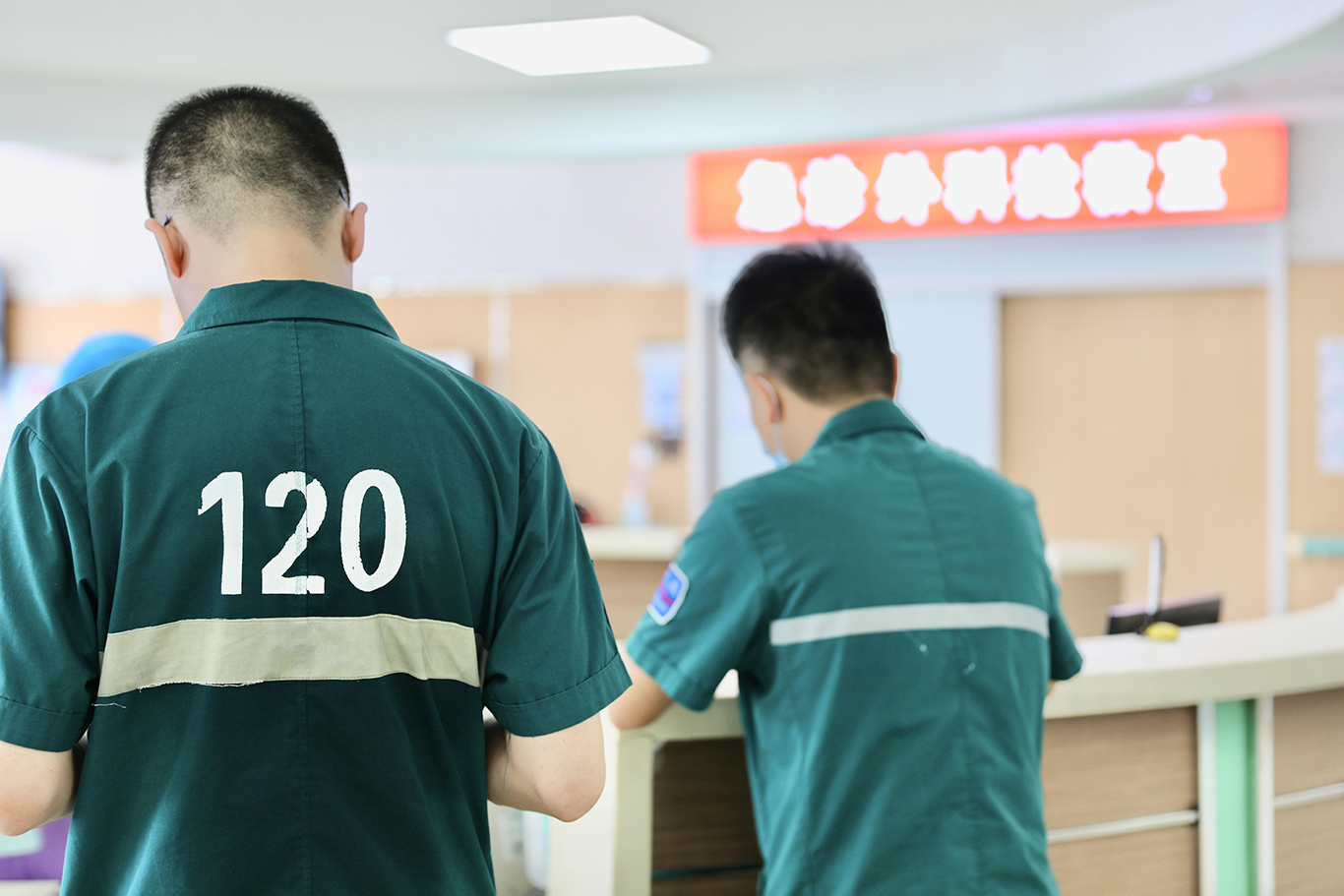 120急救中心人员完成病患的运送后,前往分诊台与护士对接病患信息与情况。与时间和生命赛跑,120救护人员的上衣已被汗水浸湿。