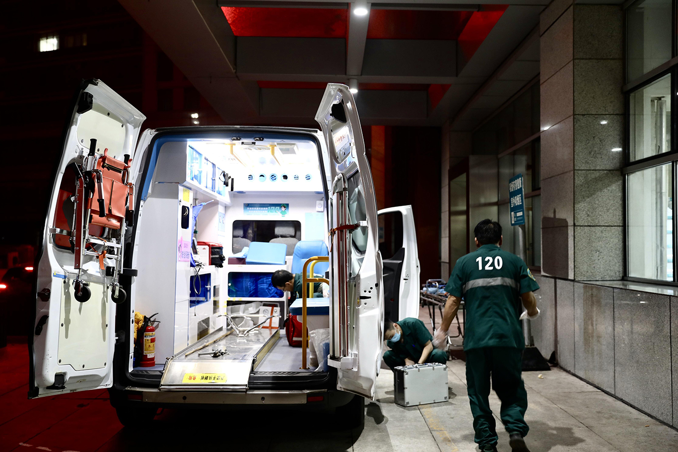 凌晨时段是急诊外科抢救室的忙碌时段。因车祸等突发情况受伤的病人被送往急诊。在运送完一位车祸受伤的患者后,120救护车团队正在清理救护车上的血渍。