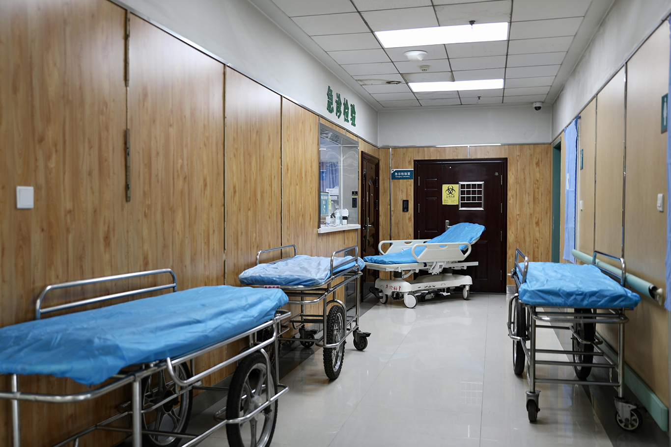 深夜的急诊难得安静。在急诊大厅一隅,放着几辆随时待命的担架车。“我们肯定是希望病人少一点,最好用不到这些担架车。”一位急诊医生说。
