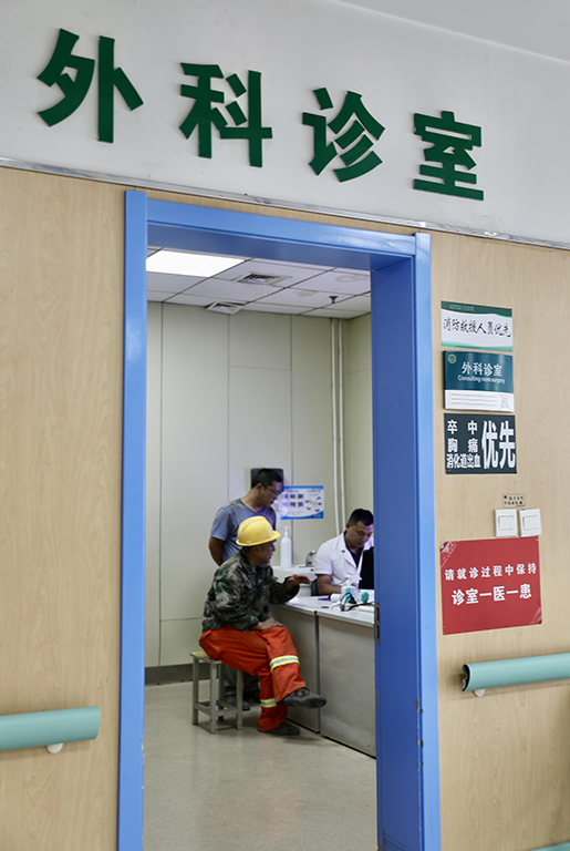 临近中午,几位工人在急诊室就诊,他们在工地作业时手臂受伤。在外科急诊科室接诊的病患中,从事高危体力劳动的人群占比较高。
