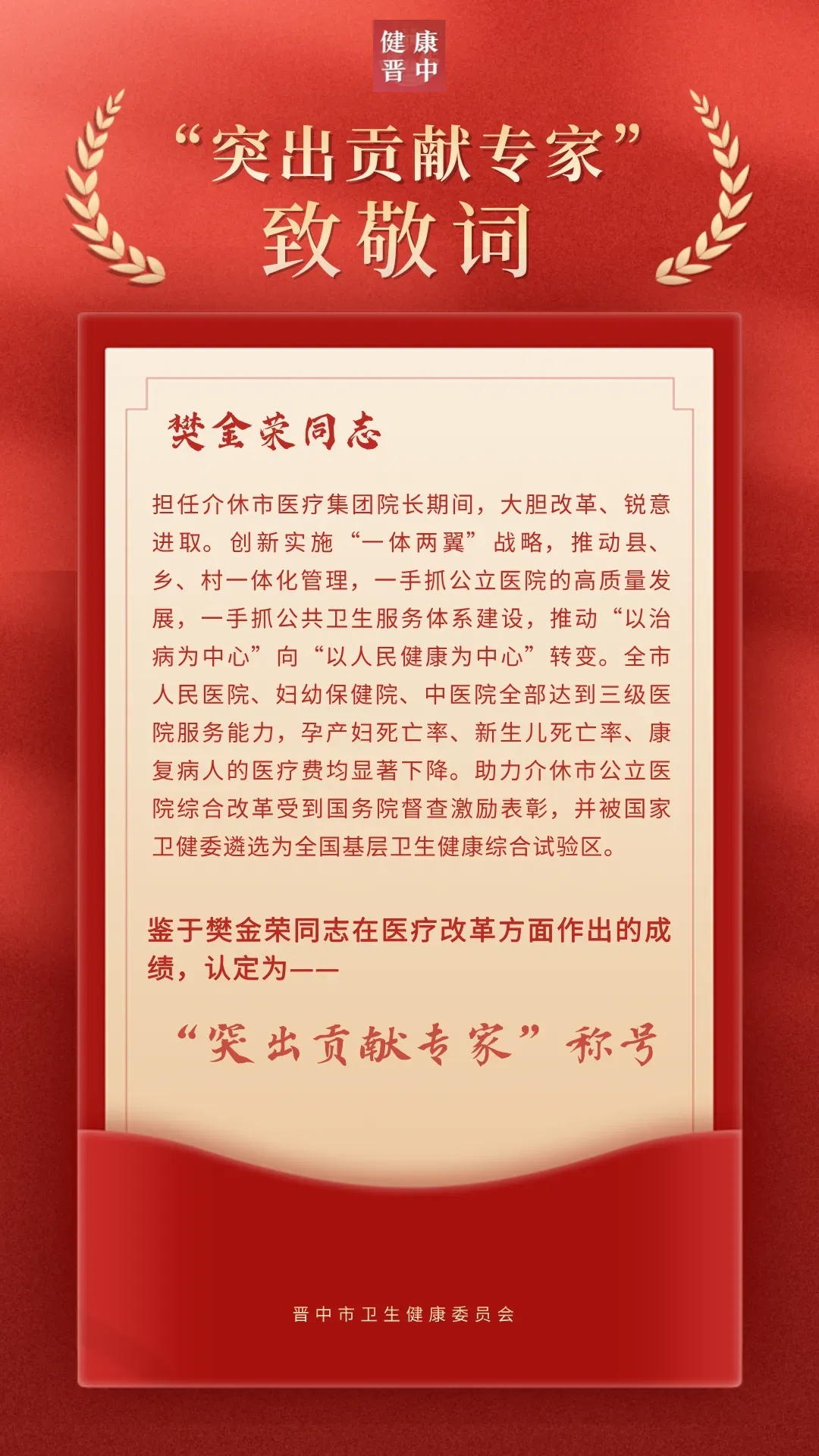 日前,晋中市卫健委公布2024年度“十百千”人才评审结果。山西省医院协会理事单位——介休市医疗集团人民医院院长樊金荣被认定为“突出贡献专家”。