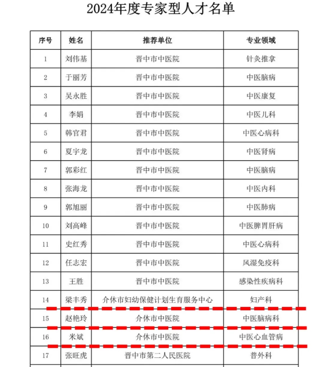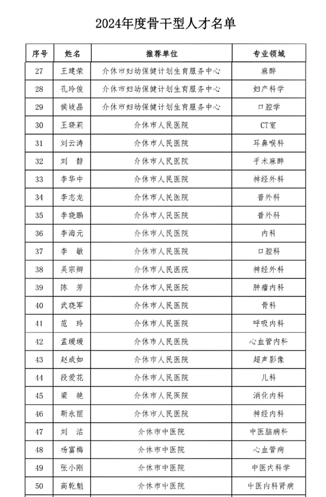 经资格审核、部门联审、专家复审、甄选委员会终审、党组会议研究和公示等环节,确定10名同志入选领军型人才、100名同志入选专家型人才、278名同志入选首批骨干型人才。柳新华、樊金荣、李功伟3名同志被认定为“突出贡献专家”。介休市妇幼保健计划生育服务中心妇产科梁丰秀、山西省医院协会理事单位——介休市中医院中医脑病科赵艳玲、介休市中医院中医心血管病米斌等三人入选“专家型人才”。介休市妇幼保健计划生育服务中心王建荣、孔玲俊、侯岐晶,介休市人民医院王晓莉、刘云涛、刘静、李华中、李志龙、李晓鹏、李海元、李敏、吴宗卿、陈芳、武晓军、范玲、孟瑗瑗、赵成如、段爱花、梁艳、靳永丽,介休市中医院刘洁、杨富梅、张小刚、高乾魁等入选“骨干型人才”