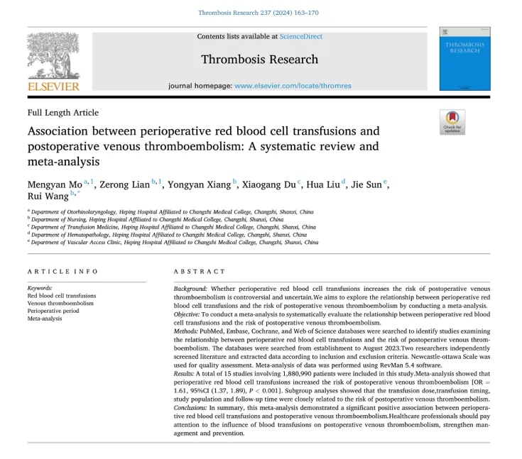该项研究创新性地采用系统评价和荟萃分析,探讨了围手术期红细胞输注与术后静脉血栓栓塞症(VTE)风险之间的关系,并通过亚组分析探讨不同红细胞输注因素对VTE风险的影响。研究结果提示,医护人员应高度重视围术期红细胞输注对术后VTE的影响,并采取行之有效的措施进行管理和预防。论文一经发表,便引起了同行的关注,被微信公众号翻译、转载。