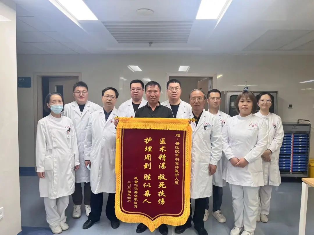 日前,患者白某英之子带着一面印有“医术精湛,救死扶伤,护理到位,胜似亲人”的锦旗风尘仆仆赶到山西省医院协会理事单位——乡宁县医疗集团人民医院骨科,感谢医护团队在其母住院期间的辛苦付出。