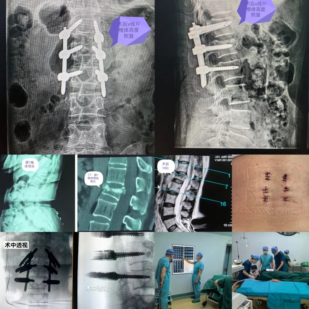 患者为女性,52岁,摔倒后腰背部疼痛、活动受限18小时入院,诊断为腰1椎体爆裂骨折。在医务科指导下,刘建国主任、贾士军主管医生和全科医务人员协同麻醉科、心内科、药剂科、中医科等兄弟科室开展多学科会诊,制定出详细手术方案。