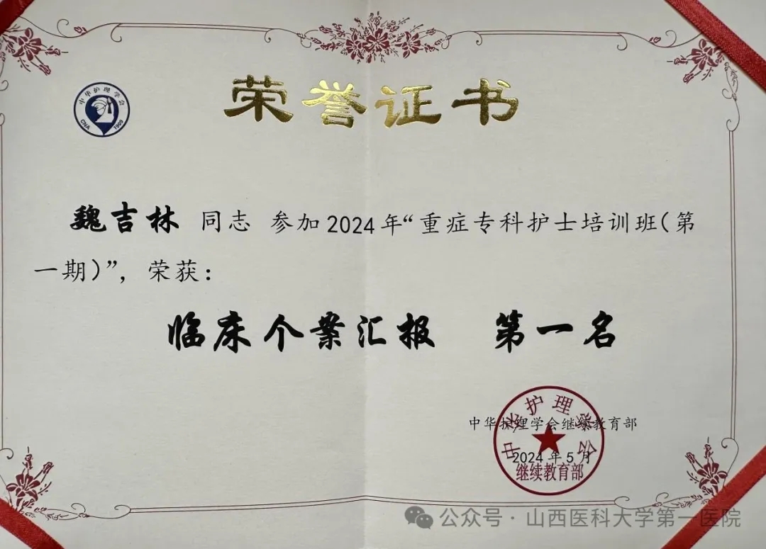 近日,历时三个月的中华护理学会2024年重症专科护士培训班落下帷幕,经过培训班专家层层筛选与审核,山西省医院协会副会长单位——山西医科大学第一医院重症医学科主管护师魏吉林的临床个案“一例重症复杂病例的规范化和精细化护理”荣获国家级重症专科护士培训个案汇报评比第一名。