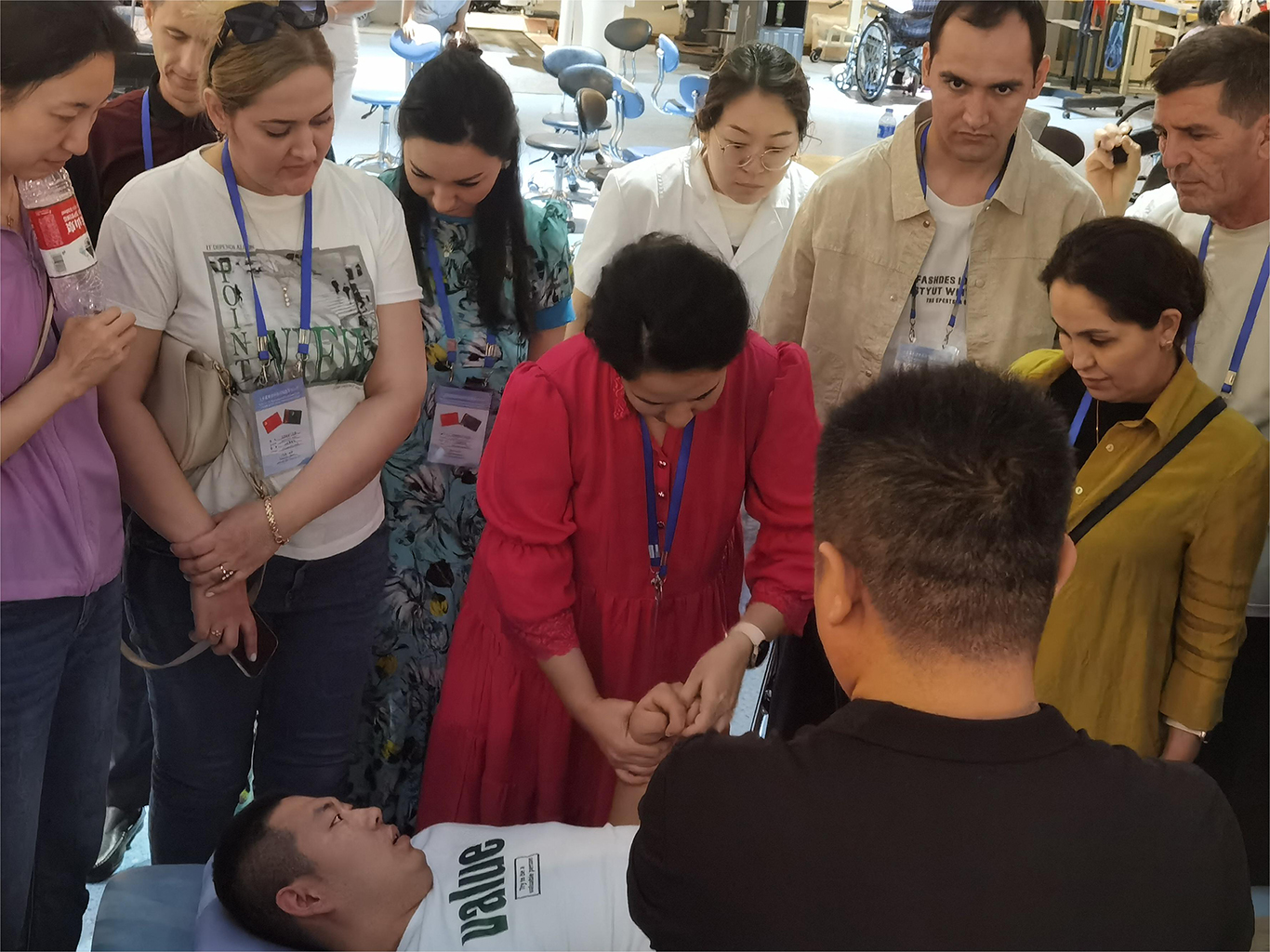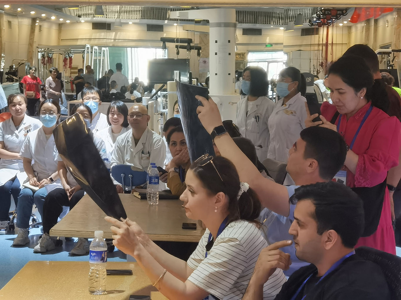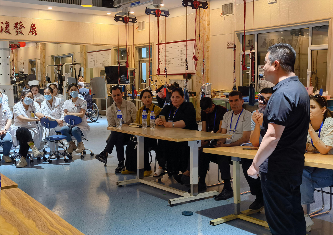 康复治疗区许静主任介绍了治疗区人员结构和大厅的配置情况并就“醒脑开窍、形神通治”的针灸效果及“头针运动疗法”的功效和操作技巧进行了讲解。国际针灸班的学员们踊跃参与患者的评估和治疗,询问主管治疗师“一对一个性化康复方案”的制订和操作规范并亲自体验下肢机器人步行训练系统、感统综合训练系统、上肢智能训练系统等现代化康复设备治疗。医院康复治疗师分享了治疗时所采用的关节松动和运动再学习技术,同时给肩痛的学员体验了放射式冲击波疼痛治疗和超声波治疗。