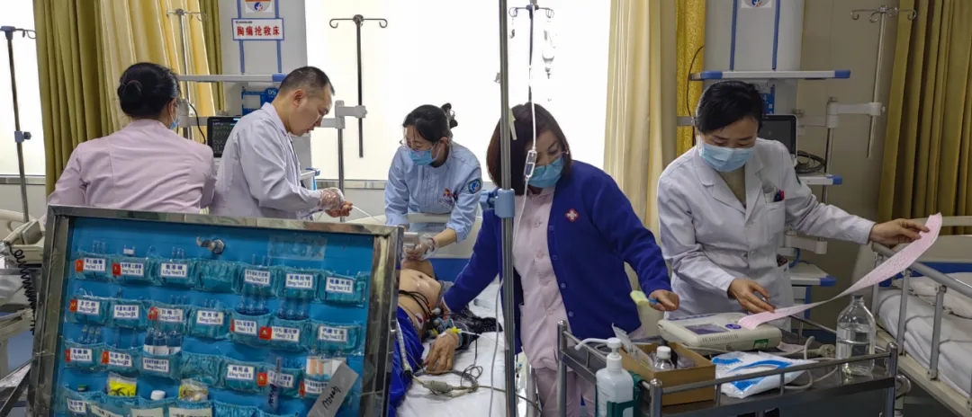 值班医师靳倩与护士立即给予患者胸外心脏按压、心脏电除颤,同时建立静脉通路、心电监护。医院带班领导许惠萍副院长及总值班董寊及时到场,为患者开通绿色通道,一切以抢救患者为先。在心血管内科负责人张佳斌及护士长赵瑞娟组织下,胸外心脏按压、抽药、注射……有条不紊地进行。