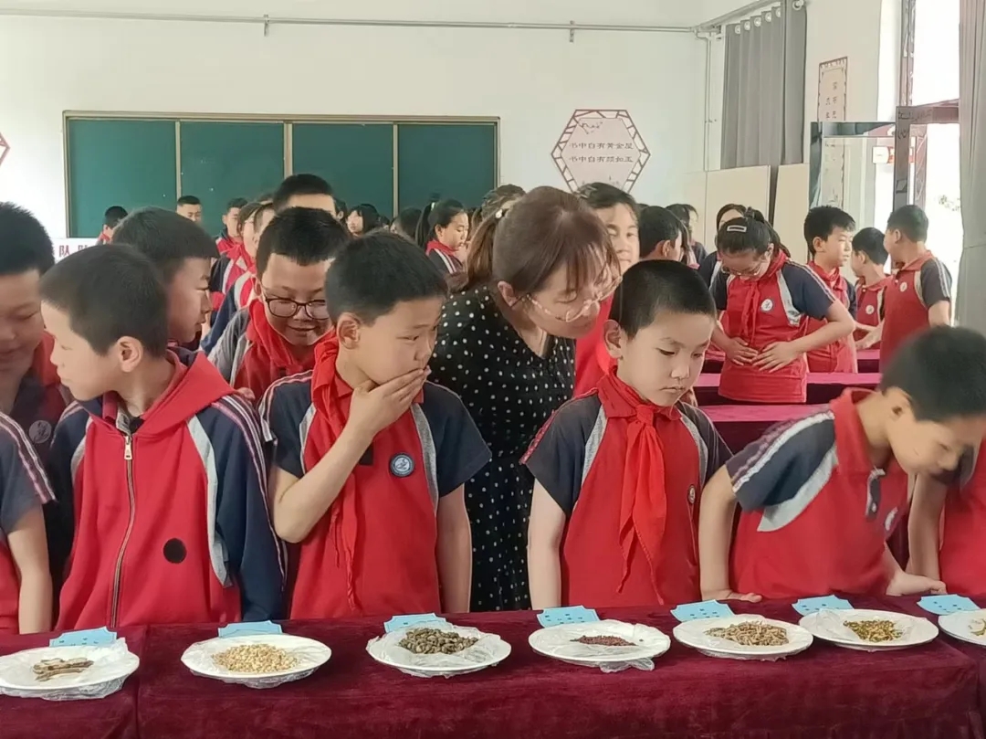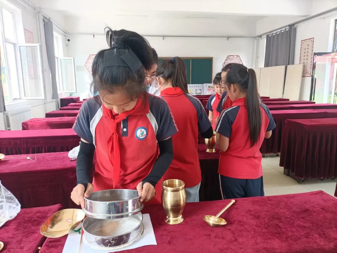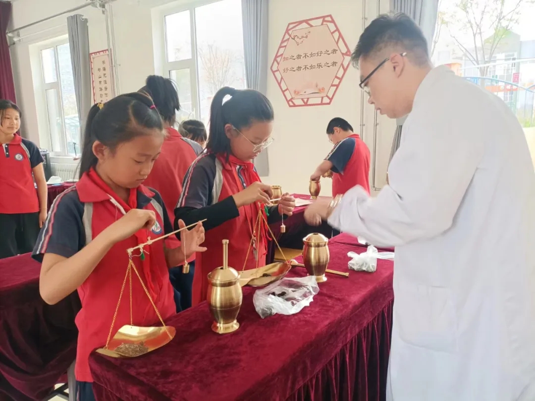 中草药辨识环节,同学们在医护人员的带领下,通过眼观、手触、鼻嗅、口尝、称量、捣杵等方式了解中草药。现场准备的山楂、枸杞、橙皮等药食同源药材,让孩子们感受到万物价值。戥子、杵臼、筛子等工具,让孩子们不仅了解了中医药的久远历史,还感受到深厚的中医文化底蕴。
