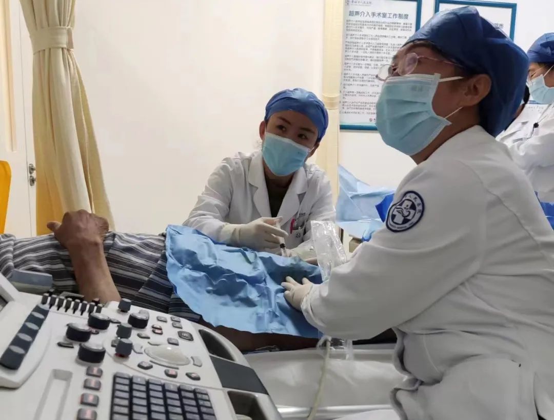 为了解决这一难题,泌尿男科韩海松副主任医师进行会诊后,建议行超声引导下睾丸鞘膜积液聚桂醇硬化剂注射治疗。超声医学科翟瑞华主任医师和王丽云副主任医师会诊后认为,鉴于患者年龄较大且基础疾病较多,睾丸鞘膜积液可行穿刺硬化治疗。在家属签署知情同意书后,医生在超声引导下为患者实施了硬化剂注射治疗,过程顺利。术后,患者可以立即行仰卧位,疼痛得以缓解。