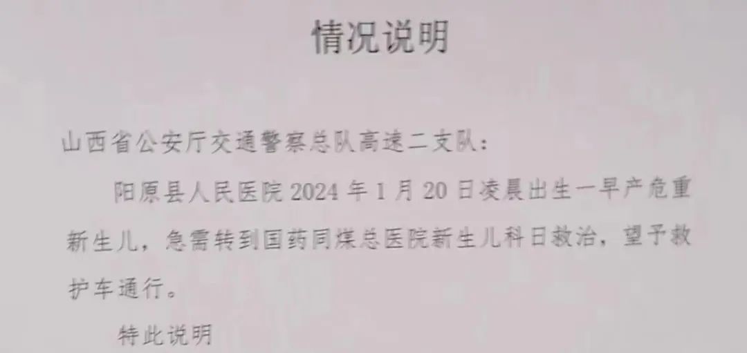 在接到高速交警放行通知后,国药同煤总医院转运团队立刻出发!在通过高速口时,执勤交警反复叮嘱,要匀速慢行,注意安全!经过4个多小时的艰难路况,小宝宝安全转运到院,众人悬着的心放了下来。