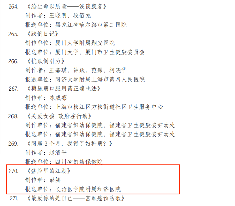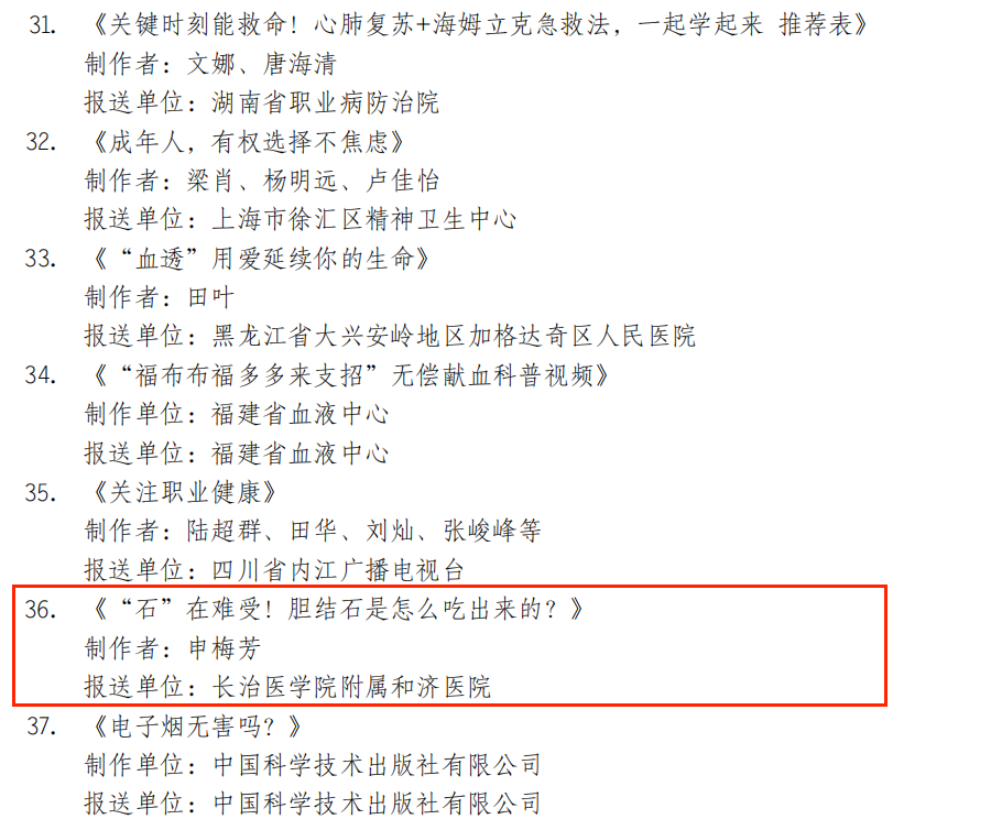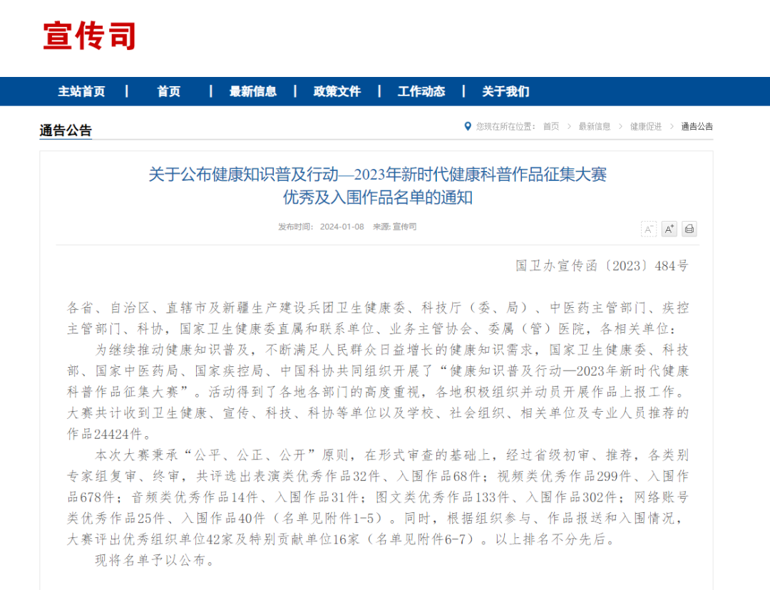 日前,国家卫健委网站公布健康知识普及行动-2023年新时代健康科普作品征集大赛优秀及入围作品名单。山西省医院协会常务理事单位——长治医学院附属和济医院选送的两件视频作品成功入围。
