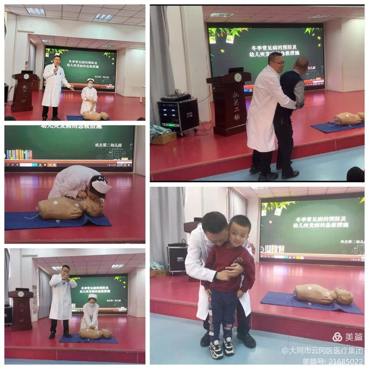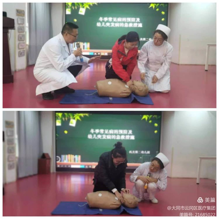 活动中,云冈区人民医院周海峰副主任医师用通俗易懂的语言和医护救治实例,把专业的传染病防控知识与心肺复苏术、海姆立克急救法等讲授给大家,并与医护人员配合进行具体步骤和细节演示。幼儿园的老师们踊跃进行实操练习,并就遇到的问题与医护人员互动。周海峰还为老师们讲解了日常生活中扭伤、烫伤、划伤、鼻出血、骨折、蜂蜇伤等情况的急救措施。