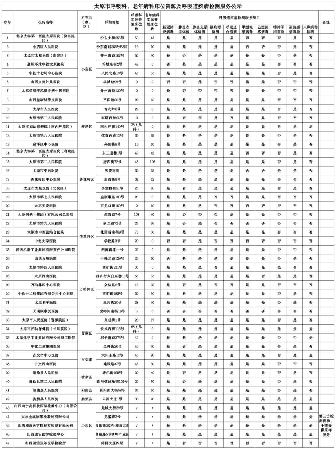 当前,呼吸道疾病进入高发期,为进一步统筹呼吸科、老年病科医疗资源,方便市民群众看病就医,太原市卫健委公布辖区内相关医院呼吸科、老年病科床位开放情况以及呼吸道疾病检测服务开展情况等信息。市民群众可就近前往相应医院就诊,有关医疗机构名单将根据医疗资源变动情况予以及时动态调整。