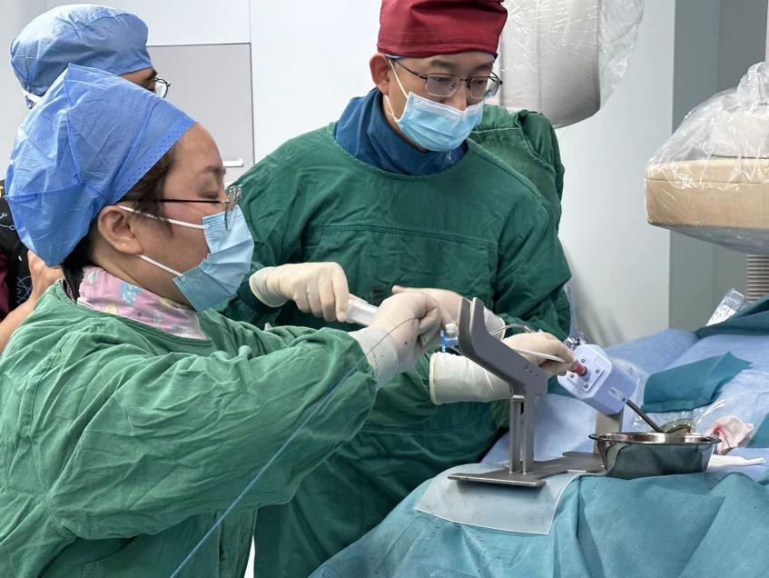 患者是一位62岁的女性,因反复胸闷在当地医院住院治疗,虽给予药物对症治疗,但效果较差,经多方打听来到山西医科大学第二医院心内科就诊并住院进一步诊治。患者术前TTE检查提示,左房、右房增大,二尖瓣瓣叶活动幅度降低,二尖瓣后叶3区脱垂,二尖瓣重度反流。经心内科主任杨滨和副主任曹慧丽带领的结构性心脏病团队诊疗和详细评估,并请心胸外科、超声科、麻醉科多学科专家会诊研讨,决定对患者实施全麻下经导管二尖瓣缘对缘修复双夹植入术。术前测二尖瓣瓣口面积为4.94cm²,DSA下两个夹子形态完好。整个手术过程仅用30分钟左右。手术后,跨瓣压差4mmHg,心脏彩超提示二尖瓣口少量偏心性反流,患者症状得到了显著改善。术后24小时,患者就可下地活动了。