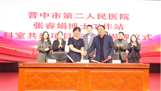 会上,刘秀峰与张睿娟签约,郭廷贞与张睿娟共同为博士工作站揭牌, 张睿娟以《浅谈血液病几个方向和进展》为题作学术交流。仪式后,张睿娟团队深入晋中市第二人民医院血液肿瘤科开展业务指导。接下来,张睿娟将定期在晋中市第二人民医院坐诊。
