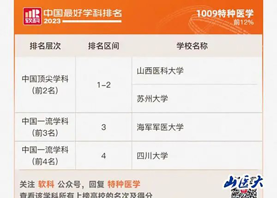 11月8日,高等教育评价专业机构软科发布“2023软科中国最好学科排名”,山西医科大学特种医学、公共卫生与预防医学、基础医学、临床医学、护理学和马克思主义理论学等6个学科上榜。其中,特种医学学科继上一年度位列全国第一后,再次蝉联全国第一,入选中国顶尖学科,这也是山西省唯一入选的顶尖学科。