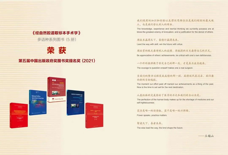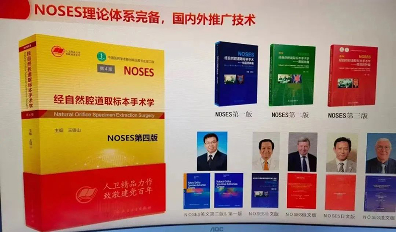 NOSES术式经过王锡山充分设计酝酿,于2010年开展世界首例直肠癌NOTES手术,2013年提出NOSES概念。多年来,经过不懈努力,王锡山创新了关于NOSES的10大类、21种术式,并撰写成书,持续出版发行学术系列专著。2016年发行第1版《经自然腔道取标本手术——结直肠肿瘤》,总结出“NOSES是理念与技术的融合,灵感与实践的碰撞,信任与动力的互助,规范与创新的相约,发展与祝愿的前行”。2018年发行第2版《经自然腔道取标本手术学——胃肠肿瘤》进一步拓宽了视野,丰富了NOSES的概念和内涵,建立了更为完善的NOSES理论体系。2019年发行第3版《经自然腔道取标本手术学——腹盆腔肿瘤》,NOSES理论扩展到了更多的医学领域。在其影响下,结直肠、胃、小肠、泌尿、妇科及消化等专业开展了“微创中的微创”手术,并提出开展NOSES要做到“一个核心、两个原则、三个法宝、四个技术”。2021年发行第4版《经自然腔道取标本手术学》,在前3版专著的基础上,第4版专著内容全面涵盖结直肠外科、胃肠外科、肝胆胰外科、胸外科、泌尿外科、妇产科、甲状腺外科和消化内科。此外,NOSES学术系列专著获得了出版界最高奖“第五届中国出版政府奖图书奖提名奖”(相当于国家科技进步二等奖),除英文版外,被外国同行翻译成俄文版、韩文版、日文版、法文版、越文版等多种语言版本,在全球发行。