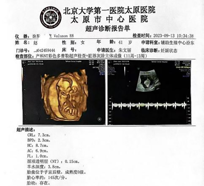 今年,41岁的赵女士无意间看到北京大学第一医院生殖与遗传中心专家单学敏教授在北京大学第一医院太原医院辅助生殖中心长期坐诊的消息,便第一时间找到单教授就诊。经过全面且详细的评估,单教授团队为赵女士夫妇制定了个性化的治疗方案,并邀请北京大学第一医院胚胎实验室专家王晟把关,最终获得2枚卵裂期胚胎、4枚囊胚,其中有2枚优质胚胎。经过充分的准备后,赵女士顺利移植1枚优质囊胚。第一次化验HCG结果呈阳性,后相关状态翻倍良好……目前,赵女士已经顺利通过孕12周NT检查,艰难的求子之路终于告一段落。