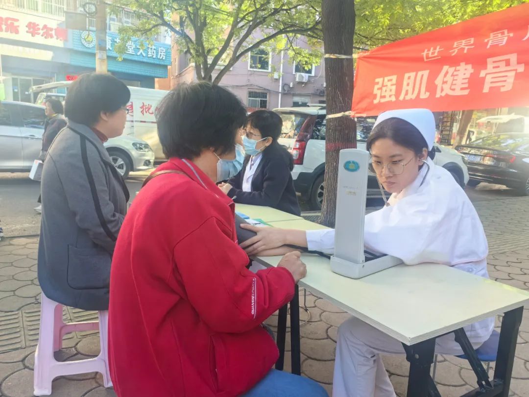 活动现场,内分泌科主任赵永红为前来咨询的居民细致检查体格,耐心答疑解惑,普及骨质疏松症的症状、危险因素以及防治等相关知识。内分泌科护士长马静达指导居民如何在日常生活中通过健康饮食、科学补钙、适宜运动来预防骨质疏松。护理志愿者王海云、吕燕为居民免费测量血压、发放防治骨质疏松宣传资料,同时对患有骨质疏松的老年人在饮食、药物方面给予指导性建议,呼吁大家养成进行户外运动的习惯和良好的生活方式,共同关注肌肉减少与骨质疏松的密切关系,更好应对骨质疏松带来的危害。活动累计提供健康咨询服务60余人次,免费测量血压60人,发放宣传手册100余份。