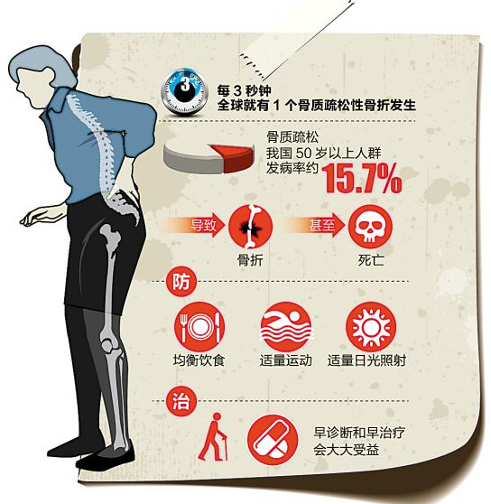 每年的10月20日是世界骨质疏松日,今年的主题是“强肌健骨,防治骨松”,旨在呼吁各界共同关注肌肉减少与骨质疏松的密切关系,更好应对骨质疏松带来的危害。为提高群众对骨质疏松症的认识及全民强健骨骼的意识。随着人口老龄化的加速和现代生活方式的改变,骨质疏松症已成为影响中老年人健康的严重问题。它又被称为无声的流行病,无声无息地在人体内发生、发展,一旦出现症状,往往已经造成了不可逆的骨损伤。因此,骨质疏松的早期诊断与预防至关重要。(吕燕)