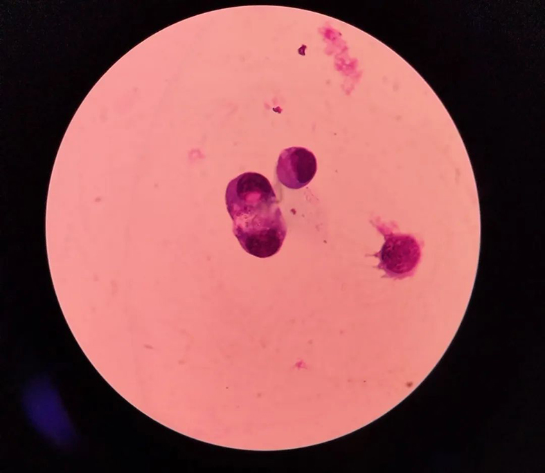 该患者因原发性肺恶性肿瘤局部肺叶切除术后头痛伴恶心进行性加重入院接受治疗。头颅CT及颅脑MRI平扫+增强均未见明显异常。肿瘤科吉海英主任考虑可能是恶性肿瘤脑膜转移,遂抽取脑脊液进行常规检测。