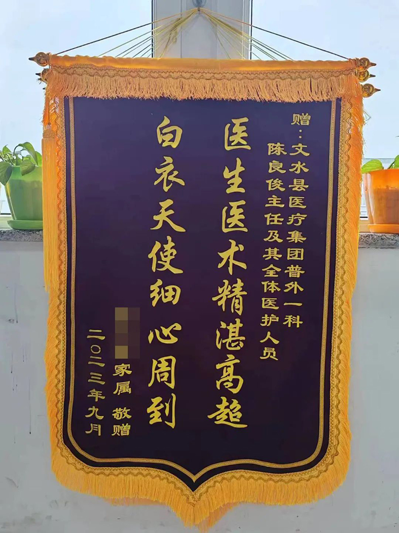 患者及家属对住院期间的治疗护理非常满意,在出院时特意制作了锦旗向普外一科医护团队表示感谢。