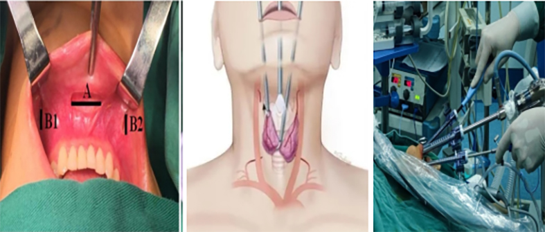 在麻醉科、手术室及护理同仁们的鼎力配合下,李云峰成功为殷女士完成了经口腔前庭入路腔镜下单侧甲状腺癌根治术。手术经口腔前庭1个直径1.2cm、2个直径0.5cm的小切口进行。术中,喉返神经完整解剖保护,甲状旁腺原位保留,出血量不到10ml,过程非常顺利。