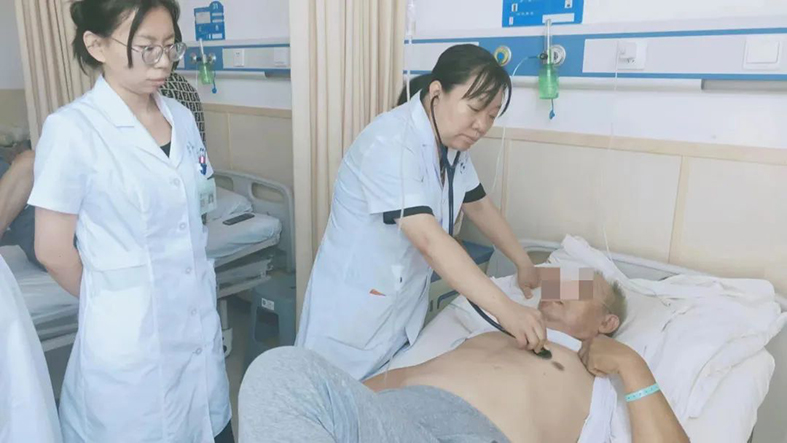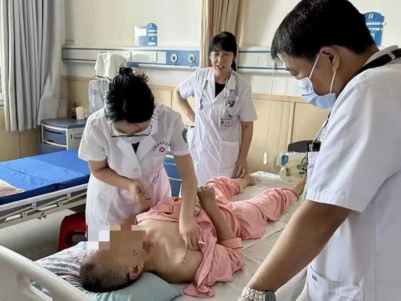 ▲康复科裴晋云主治医师正在查看外伤性脊髓损伤术后、创伤性脑出血导致左侧肢体功能障碍患者,并指导医护人员进行神经系统定为的精细查体。