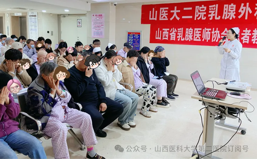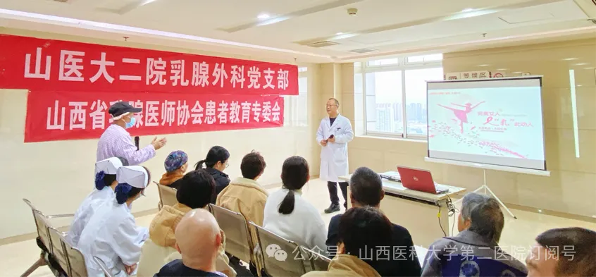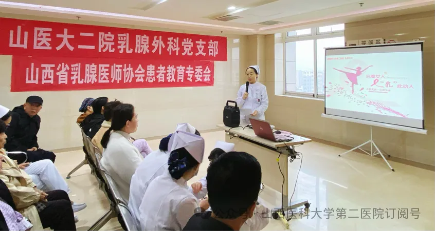 10月17日,山西省医院协会副会长单位——山西医科大学第二医院乳腺外科暖意融融,一场以“给自己和身边的她一个拥抱”为主题的粉红丝带健康科普活动在病区大厅温馨展开。乳腺外科党支部负责人许慧娟带领科室党员积极行动,真正做到了“我为群众办实事”。现场座无虚席,患者及家属踊跃参与,在温馨互动中收获乳腺癌防治知识与心理关怀。
