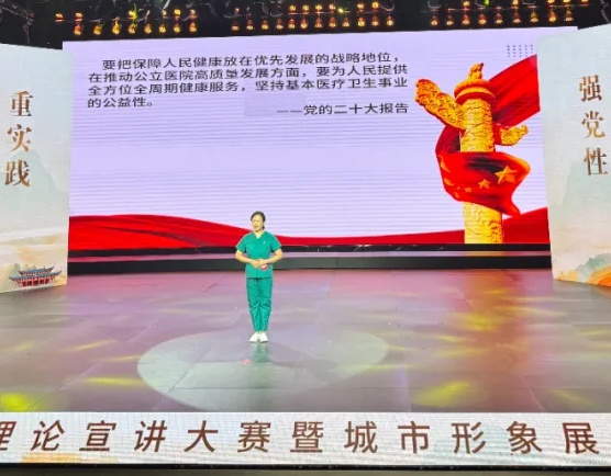 太原市第三人民医院党委高度重视此次比赛,选送优秀选手报名参加,并以此为契机进一步打造太原市理论宣讲先进集体——“肝胆相照•永远跟党走”宣讲志愿服务队,营造学习宣传贯彻党的二十大精神的浓厚氛围。张璠是太原市“最美时代新人”,该院“肝胆相照·永远跟党走”宣讲志愿服务队队员。赛场上,她以《无影灯连山海 绿衣天使践誓言——把“人民至上”践行在每一台手术上》为题,讲述了该院医护人员立足岗位、担当奉献的时代故事。