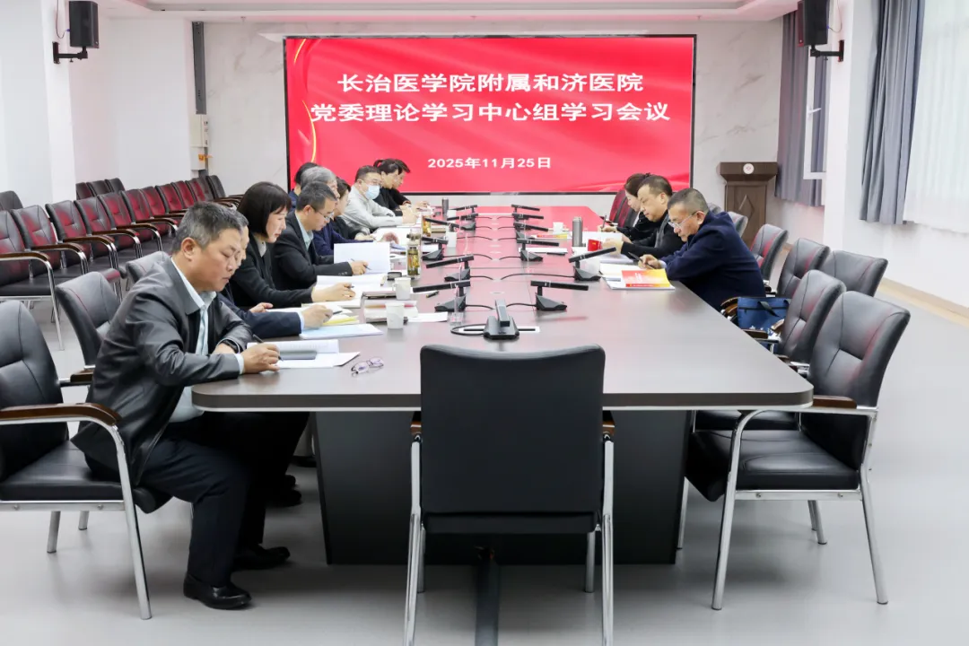 2025年11月25日,山西省医院协会常务理事单位——长治医学院附属和济医院召开党委理论学习中心组学习会,集中学习习近平总书记在《求是》杂志发表的重要文章《因地制宜发展新质生产力》《关于〈中共中央关于制定国民经济和社会发展第十五个五年规划的建议〉的说明》等内容。长治医学院党委副书记、校长王旭到会指导。长治医学院附属和平医院党委书记、院长张文平,宣传科科长韩晓晶列席交流。和济医院党委书记郝少峰主持学习会。
