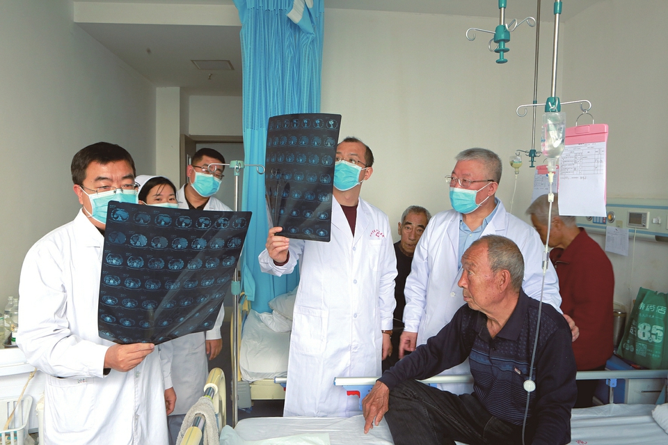 10月15日,忻州市第二人民医院病房内,来自中国医学科学院肿瘤医院的专家正在为患者进行会诊。据了解,此次由国家卫生健康委、国家中医药管理局组织的国家巡回医疗队走进忻州,开展为期一个月的义诊活动。(李春泽)