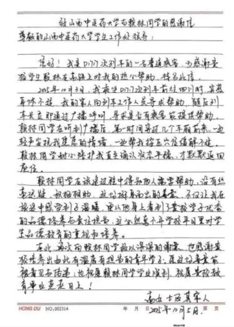 “感谢赖林同学,也感谢贵校培养出如此温暖、有担当的青年学子,愿这份善意能被看见与传递……”近日,山西中医药大学收到的一封装载千里谢意的手写信与锦旗,揭开一列飞驰高铁上发生的暖心故事。
