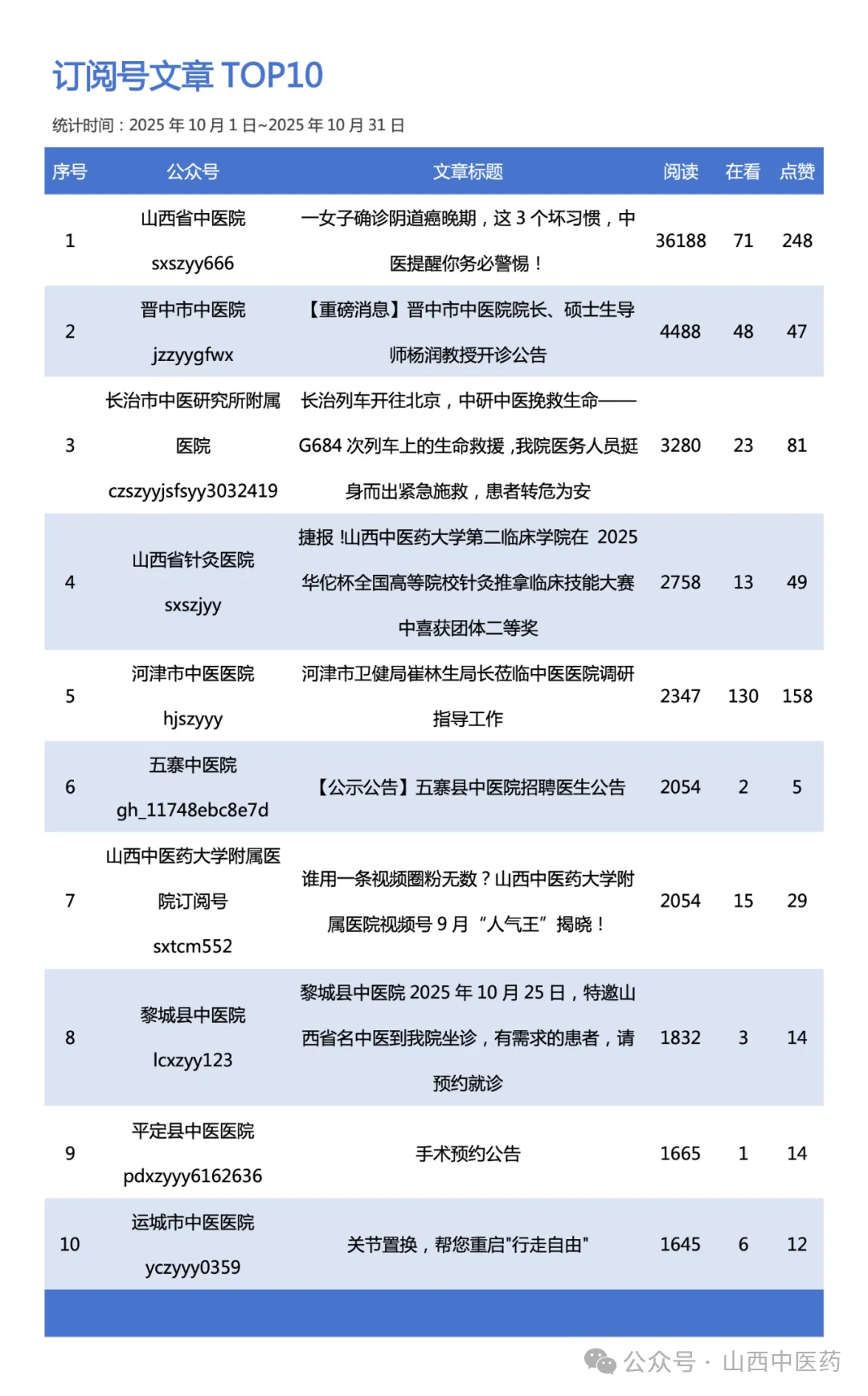 订阅号文章TOP10丨监测月10月,山西省中医院发布的《一女子确诊**癌晚期,这3个坏习惯,中医提醒你务必警惕!》,广受关注。