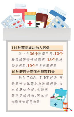 聚焦临床急需、医保可负担——进医保的114种药品中,有36个肿瘤用药、12个糖尿病等慢性病用药、13个抗感染类药品、10个罕见病用药等,29种临床用不上、或有更好替代的药品被调出目录。