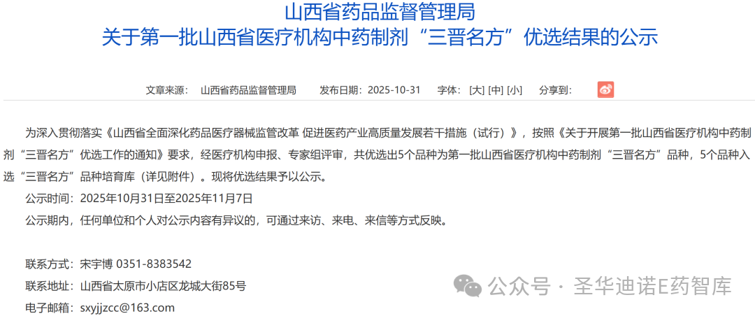 日前,山西省药品监督管理局公示第一批山西省医疗机构中药制剂“三晋名方”优选结果,经医疗机构申报、专家组评审,共优选出5个品种为第一批山西省医疗机构中药制剂“三晋名方”品种,5个品种入选“三晋名方”品种培育库,详细信息附后……